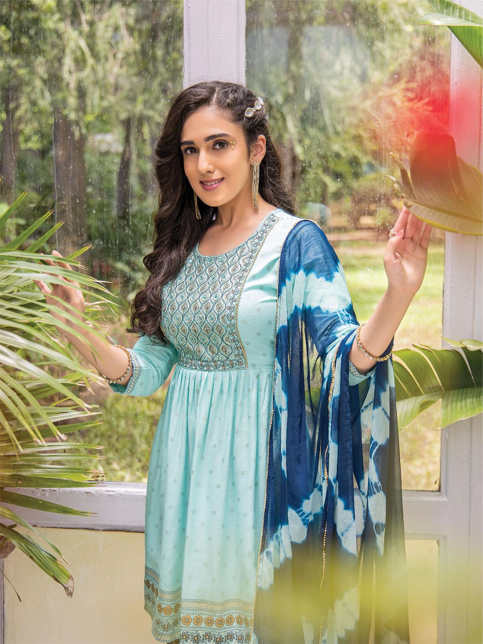 Green Cotton Embellished Ethnic Printed Kurta With Flared Palazzo And Dupatta