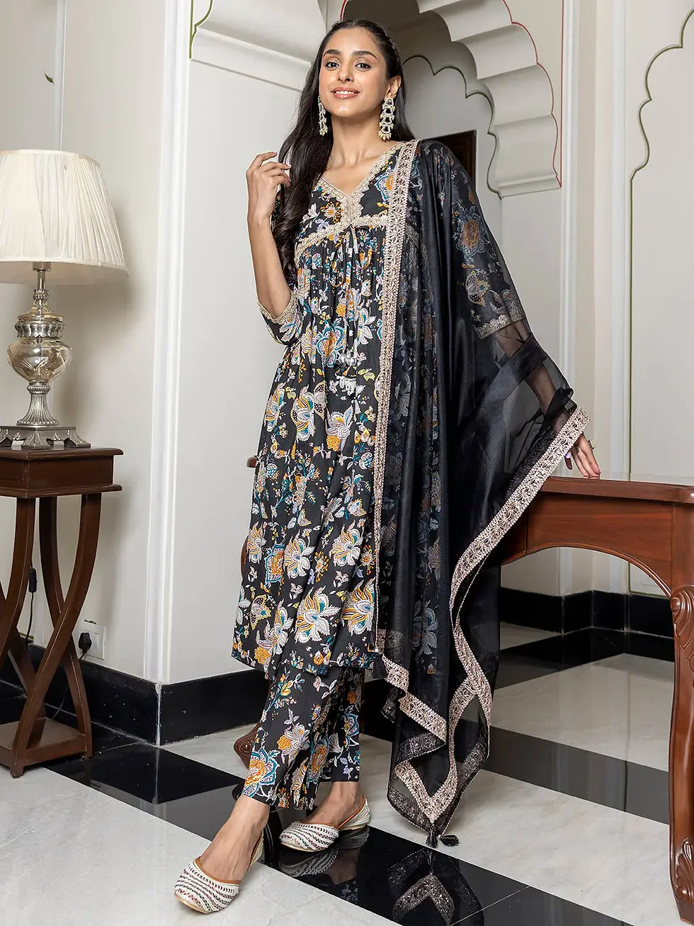 Black Cotton Embellished Kurta With Palazzo And Dupatta